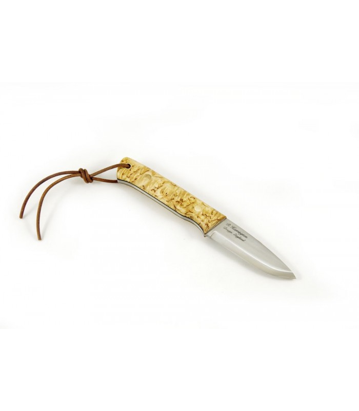Das Messer ist full tang, mit einer circa 9 cm langen Klinge mit Scandischliff. Der Griff ist gerade und hat abgerundete Kanten, so dass er in möglichst viele Handgrössen passt. Das Messer wird mit einem Lederlanyard und einer Lederscheide geliefert.