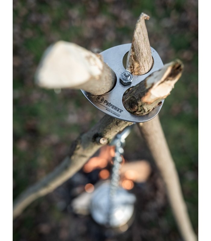 Der Dreibein-Ring bietet dir vieles, vor allem aber: Abenteuer nach deinen Vorstellungen Die leichte Edelstahl-Scheibe ist das Grundgerüst für ein selbstgebautes Dreibein aus Ästen. Diese führst du durch die Aussparungen und festigst sie durch leichtes Verdrehen. Damit ist deine Draußen-Kochstelle zum Einsatz bereit und dein Bushcraft-Lager oder deinen Biwak-Platz für die Nacht eingerichtet. Dank der beiden Haken mitsamt Kette lassen sich problemlos dein Feuertopf und dein Teekessel über die knisternde Feuerstelle hängen. Die benötigte Hitze regulierst du ganz einfach durch die Einstellung der Kettenlänge.