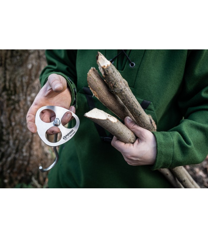 Der Dreibein-Ring findet in jeder Art von Gepäck Platz, denn mit 450 g Gesamtgewicht kannst du die Scheibe sowie beide Haken und Kette einfach verstauen und auf deine Entdeckungstouren mitnehmen. In der natürlichen Umgebung deines Lagerplatzes findest du die notwendigen Äste und bleibst so draußen völlig unabhängig. Den Dreibein-Ring kannst du darüber hinaus auch benutzen, um dir einen stabilen Unterstand oder ein Tipi für die Nacht zu bauen, wenn dein Hunger gestillt ist.