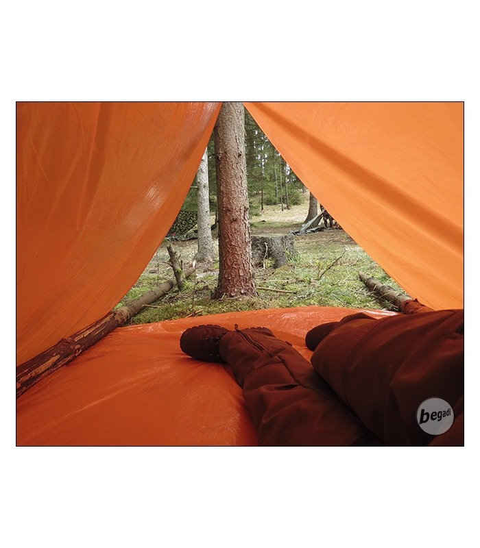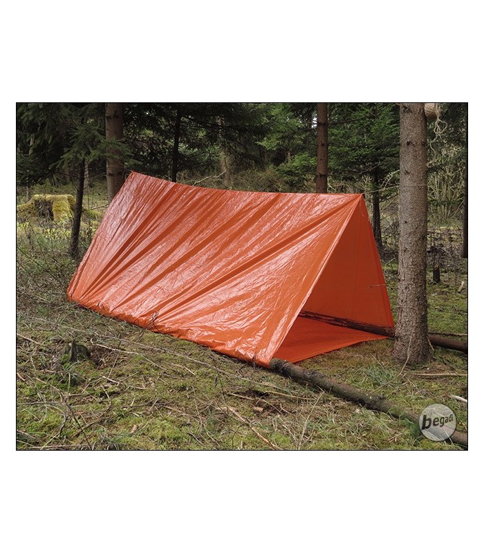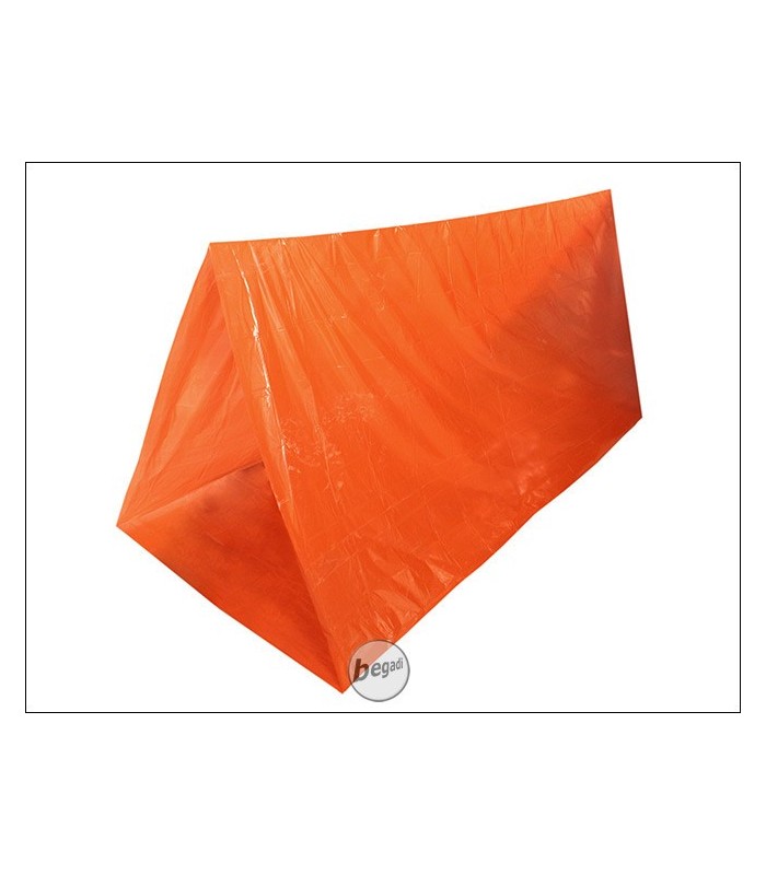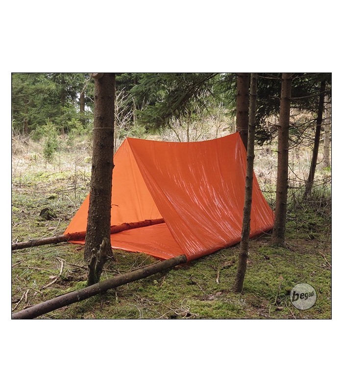 Leichtes, kompaktes Notzelt, für Wanderer und Trekker. Passt sogar in die Beintasche einer Cargohose, kann mit 3 Schnüren oder einem Holzgestell schnell aufgebaut werden. Schnell schlägt das Wetter auf Tour um, man verläuft sich oder kommt in eine Unwetterfront abseits von Schutzhütten. Hier dient das Zelt als Notunterkunft bei jenen Wetterwechseln oder unvorhergesehenen Aufenthalten, es ist jedoch nicht als Dauerlösung gedacht. Bei einer Länge von ca 230cm bietet das Zelt einen auf 2 Seiten geschlossenen Schutzraum mit Boden von ca 90cm Breite und Höhe.Schlägt man ein Ende um, kann das Zelt auch als Notbiwaksack für 1-2 Personen benutzt werden. Der orange Farbton erleichtert Rettern/Suchmanschaften das Auffinden in Notfall.